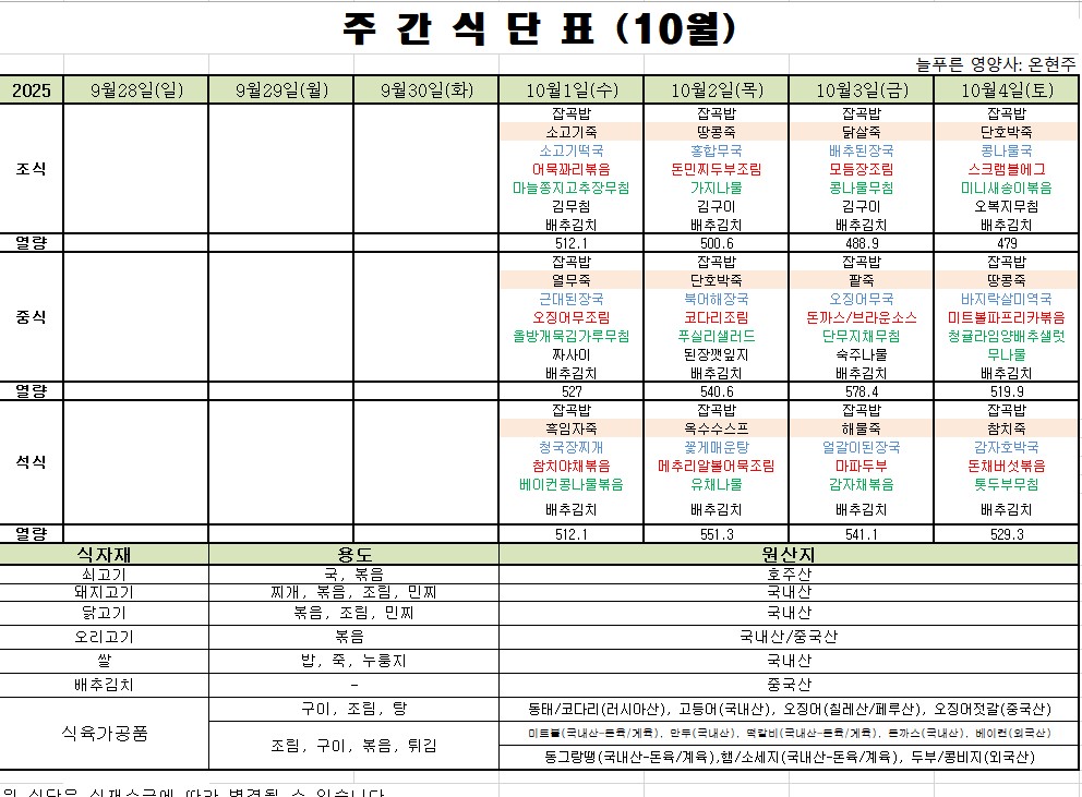 10월 1째주 식단표입니다