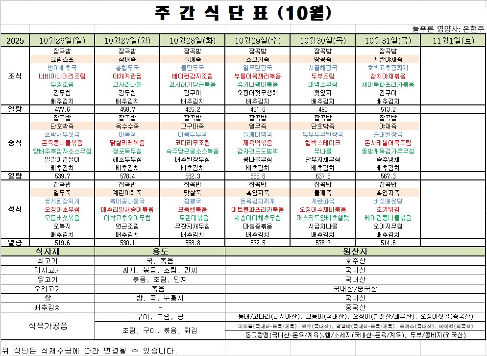 10월 5째주 식단표입니다