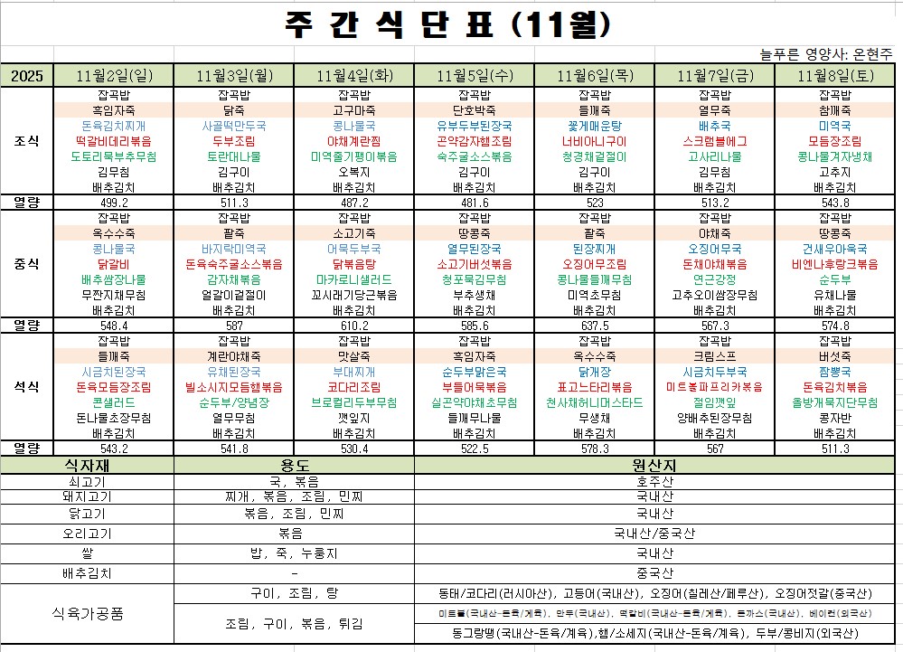 11월 2째주 식단표입니다
