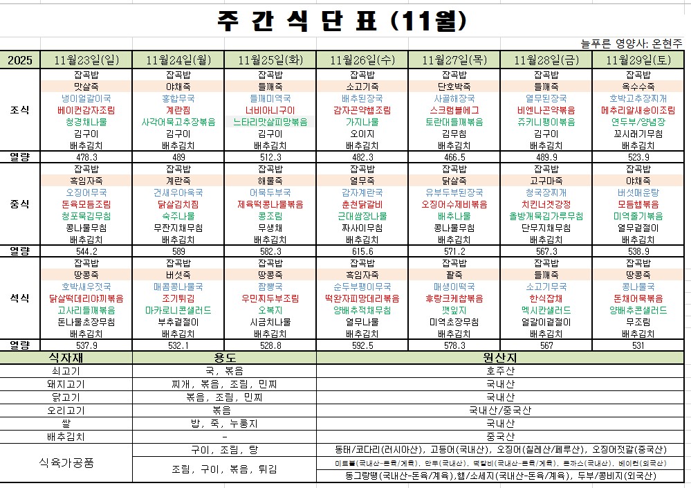 11월 5째주 식단표입니다