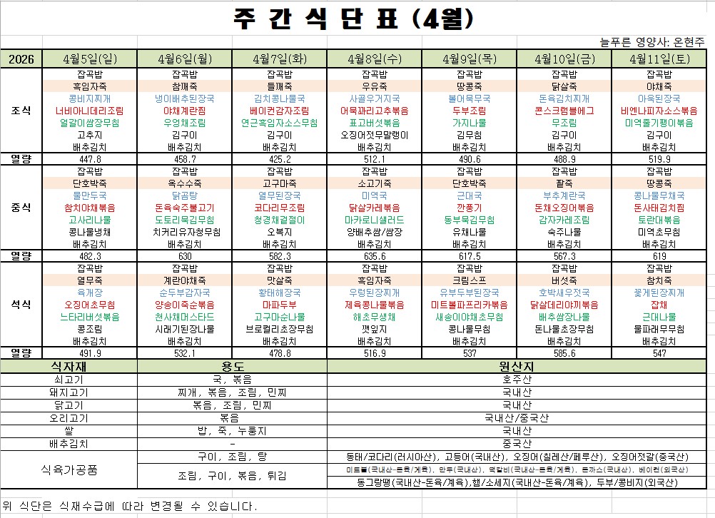 4월 2재주 식단표입니다
