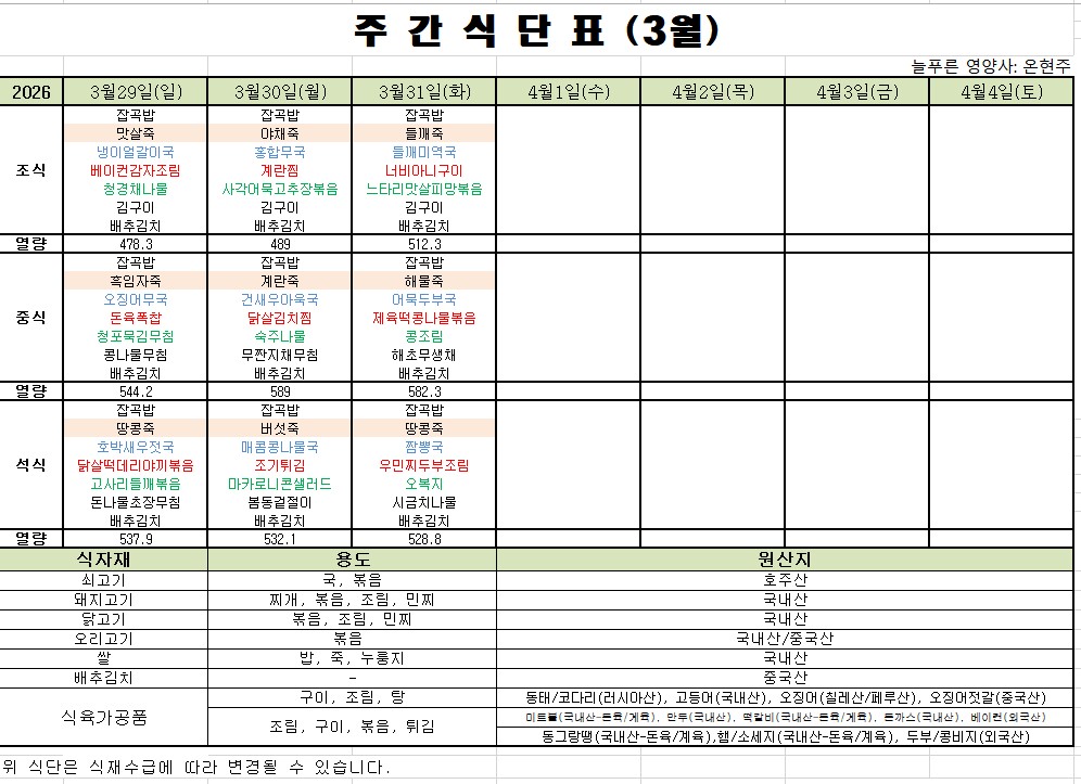 3월 5째주 식단표입니다